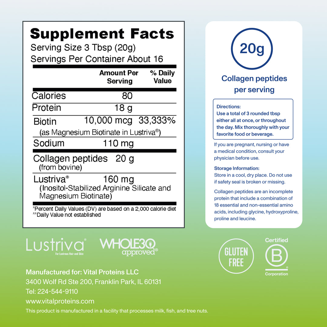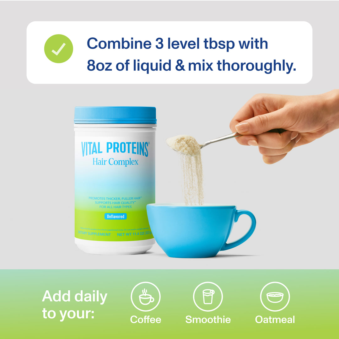 Vital Proteins Hair Complex is a unique blend of Vital Proteins unflavored collagen peptides plus a biotin complex, Lustriva® that helps grow thicker, fuller hair in 12 weeks.**