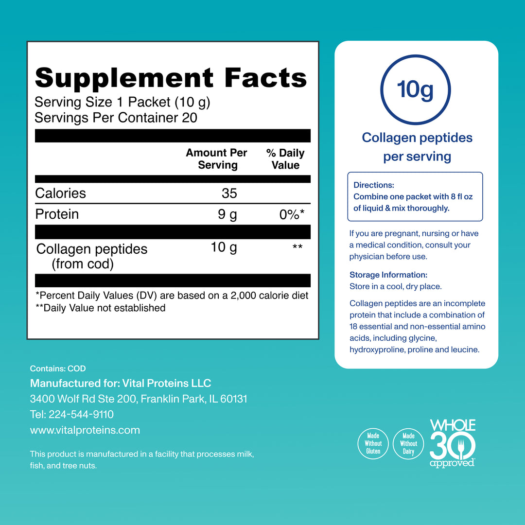 Vital Proteins Marine Collagen Peptides are made from the scales of fresh, non-gmo, wild-caught cod. Mixes easily with coffee, no added taste. Choose between our Marine Collagen Peptides powder or capsules.