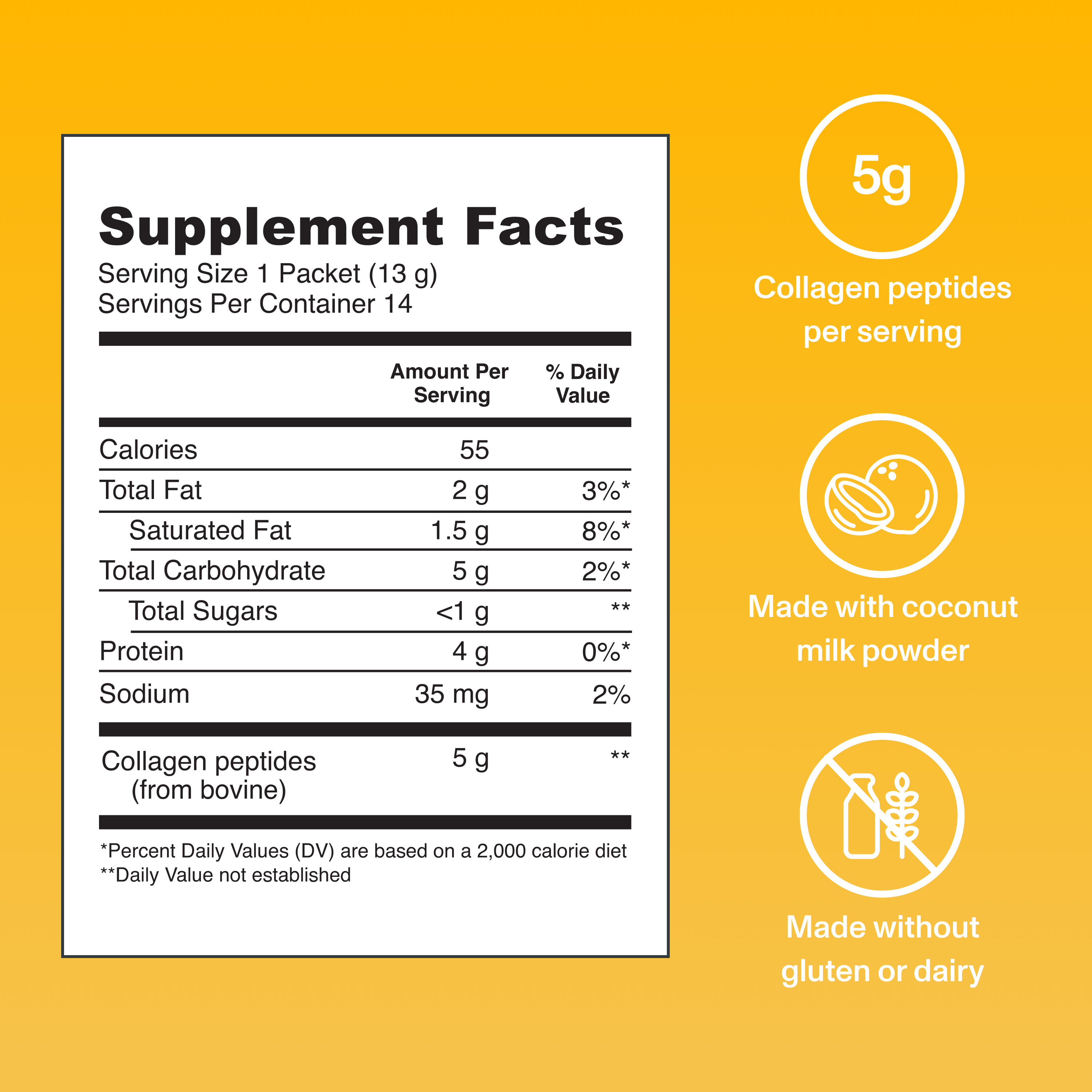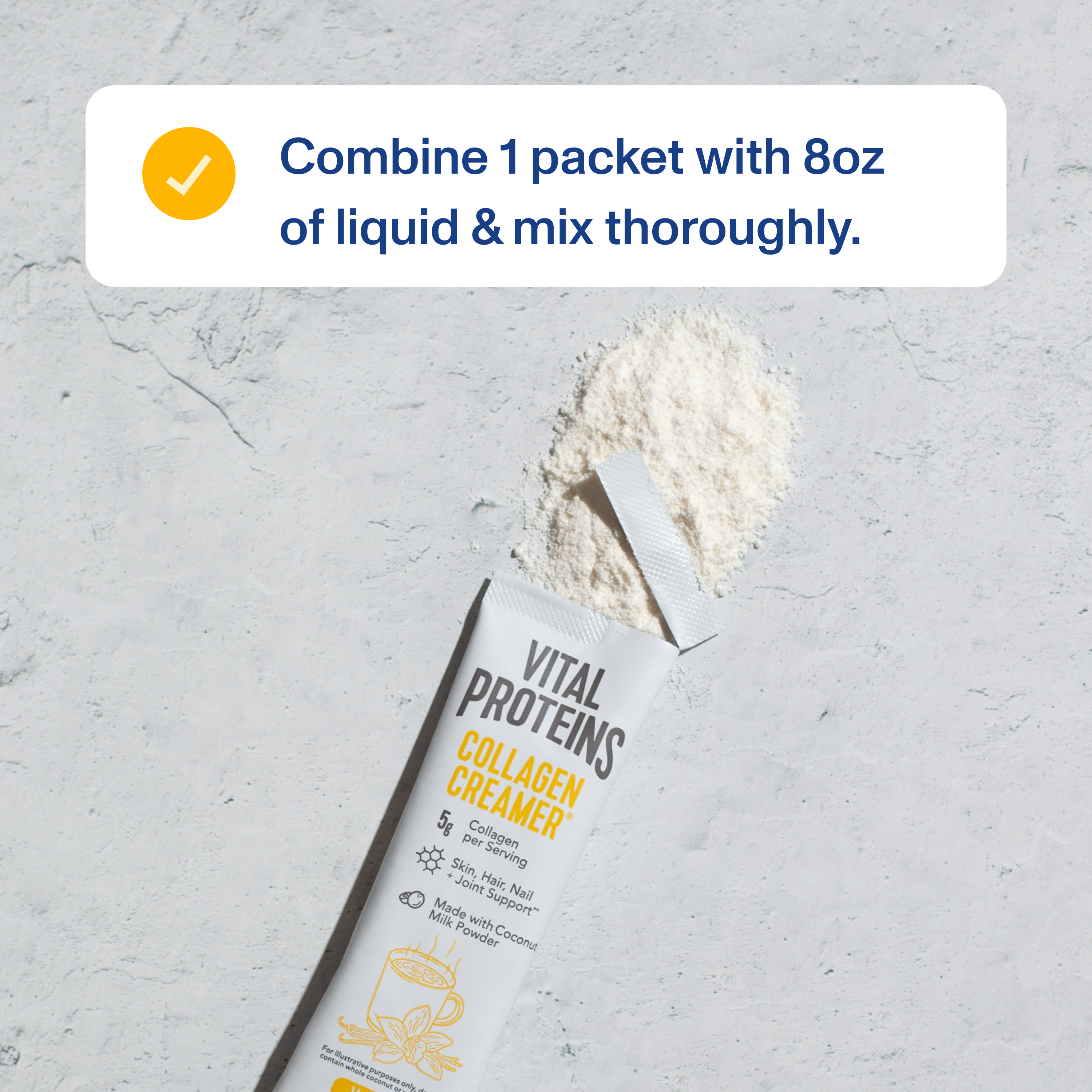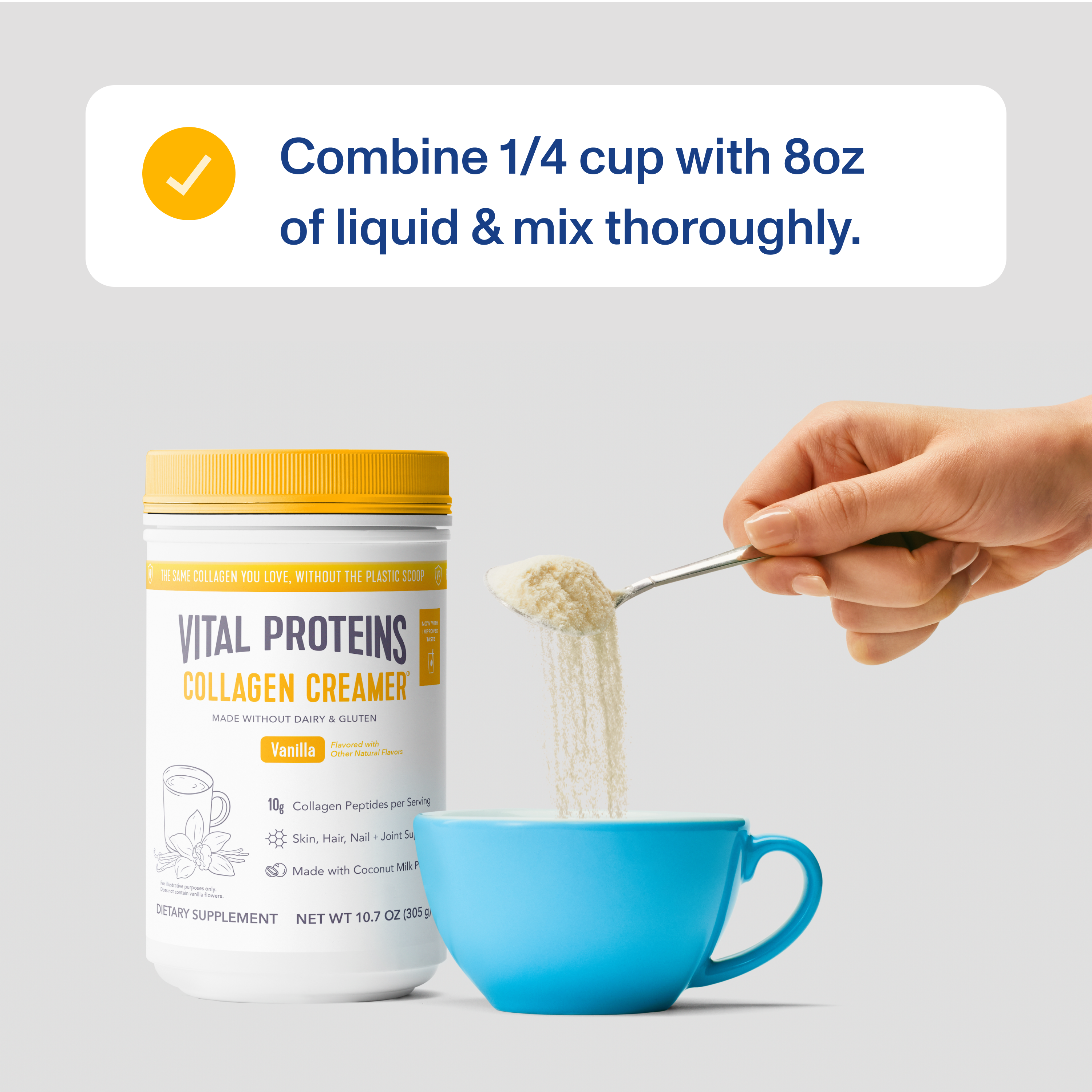 For a made-without-dairy upgrade to your morning routine, reach for Vital Proteins Collagen Creamer® in Vanilla! Packed with 10g of collagen per serving and MCTs from coconut milk powder, this morning staple ensures a peppy start to any day.